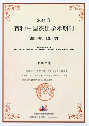 12月7日,中国科技期刊相关指标由中国科技信息研究所在北京发布。由中科院长春应化所和中国化学会共同主办、汪尔康院士任主编的《分析化学》荣获2011年“中国百种杰出学术期刊”称号。2011年总被引频次4019次,影响因子1.327,综合评价总分82.3,在化学类期刊(35种)中分别位居第1名、第2名和第1名。