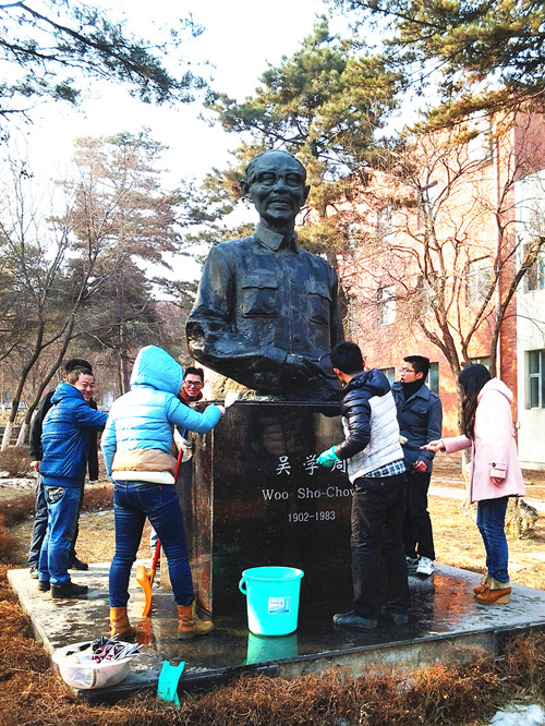 3月15日一大早,在党支部书记和班长的带领下,全体志愿者划分成若干小组,分别清理篮球场、为吴学周先生雕像除尘、清洗实验楼前牌子等。天气虽然寒冷,但同学们的劳动热情高涨。大家团结一致,男女同学分工合作,经历一个多小时的努力终于将篮球场的积雪和冰块清理干净,虽然除冰过程十分艰辛,同学们却感到非常愉快。在清洗吴学周先生的雕像时,大家都满怀敬仰,仔细认真地清洗每一处地方,除去灰尘的雕像在阳光下分外明亮,大家忍不住在雕像前合影留念。