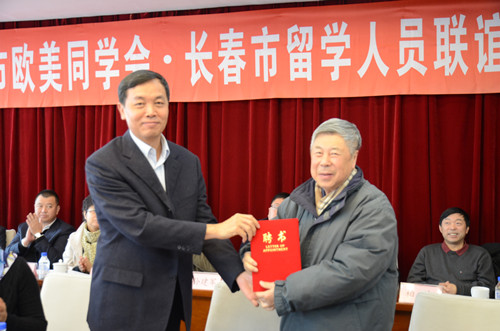 会议一致同意,长春市留学人员联谊会第一届理事会会长汪尔康院士当选为名誉会长。长春市政协副主席,统战部刘德生部长为汪尔康院士颁发了聘书。