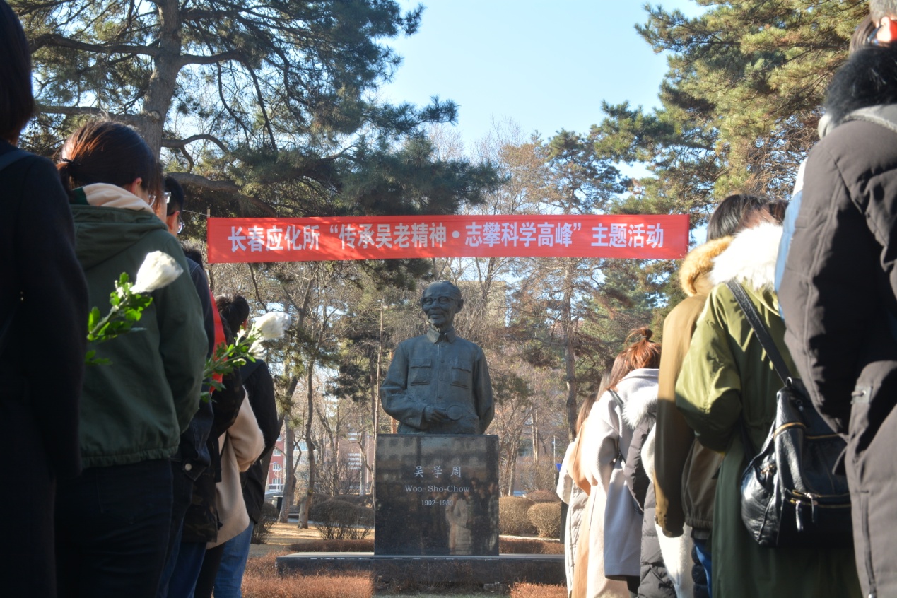 在2018年清明节前夕,所团委和研究生部在吴学周先生雕塑前共同举办了“传承吴老精神·志攀科学高峰”主题活动,缅怀著名物理化学家、老所长吴学周先生,学习和传承吴老等老一辈科学家热爱祖国、追求真理、严谨治学、无私奉献的爱国情怀和科学精神。这项活动是“所庆70周年”系列活动之一,百余名研究生同学参加了这次活动。