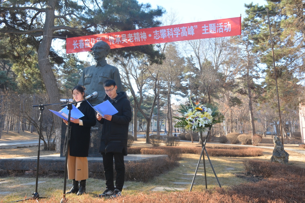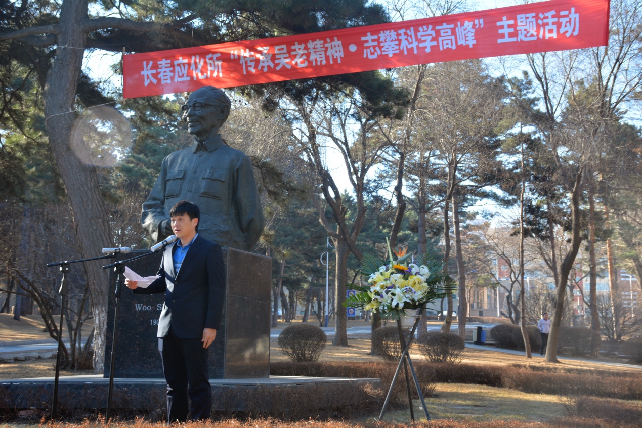 所团委负责人致辞并号召同学们要把“传承吴老精神·志攀科学高峰”主题活动作为缅怀先辈、净化灵魂、鼓舞斗志、激发爱国爱所情感的形式坚持下去,把老一辈科学家留下的宝贵精神财富传递下去,使他们的不朽精神开花结果,发扬光大。要以敬爱的吴学周先生为光辉榜样,牢记肩负的使命和责任,勇敢擎起科学精神的旗帜,志存高远,勇攀高峰,为长春应化所的创新发展,为国家的繁荣富强而努力奋斗!