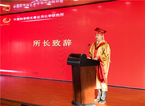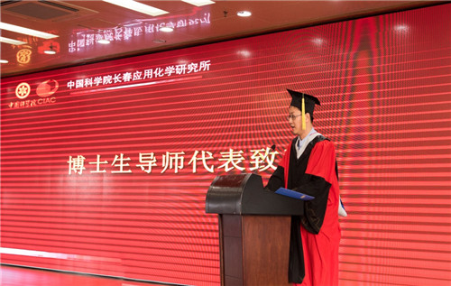 博士生导师陈全研究员作为导师代表致辞。他勉励全体毕业生继承发扬应化所的优良传统、传承应化人的精气神,不忘初心、薪火相传,实现精彩人生、成为应化所的骄傲和中国应用化学的希望。