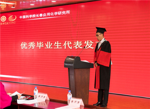 优秀毕业生吴世龙代表全体毕业生上台发言,表达了对老师辛勤培养的感谢,表达了对家人默默支持的感谢,同时也表达了对无限美好未来的憧憬。他表示应化所给了所有学生坚实的基础,使其充满自信地面对人生挑战、创造属于自己的未来。他说,毕业生们将再次扬帆起航,携手并进、共铸辉煌。