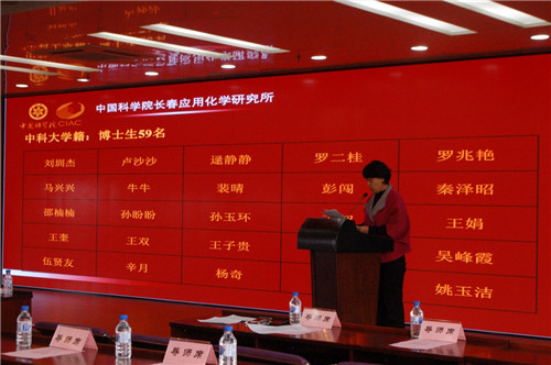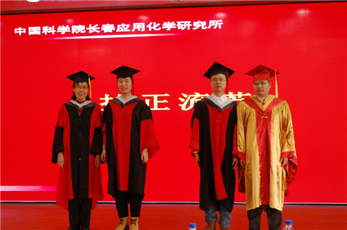 刘靖宇处长宣读2019年冬季毕业生名单后,杨小牛所长、杨秀荣院士为2019年冬季毕业生一一扶正流苏并合影,祝福全体毕业生载着应化所的祝愿、带着亲人的希望、向着新的征程扬帆起航。
